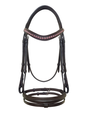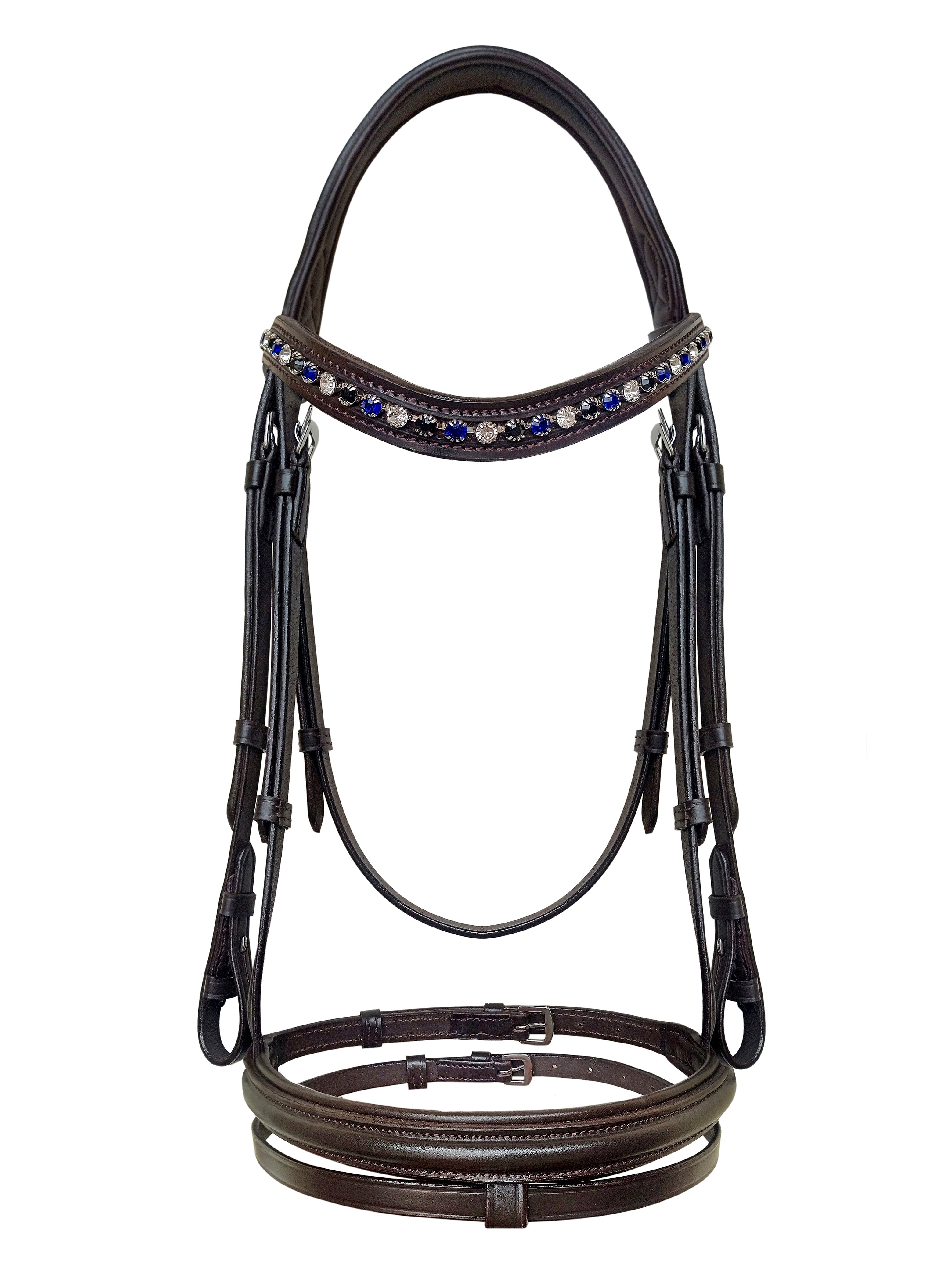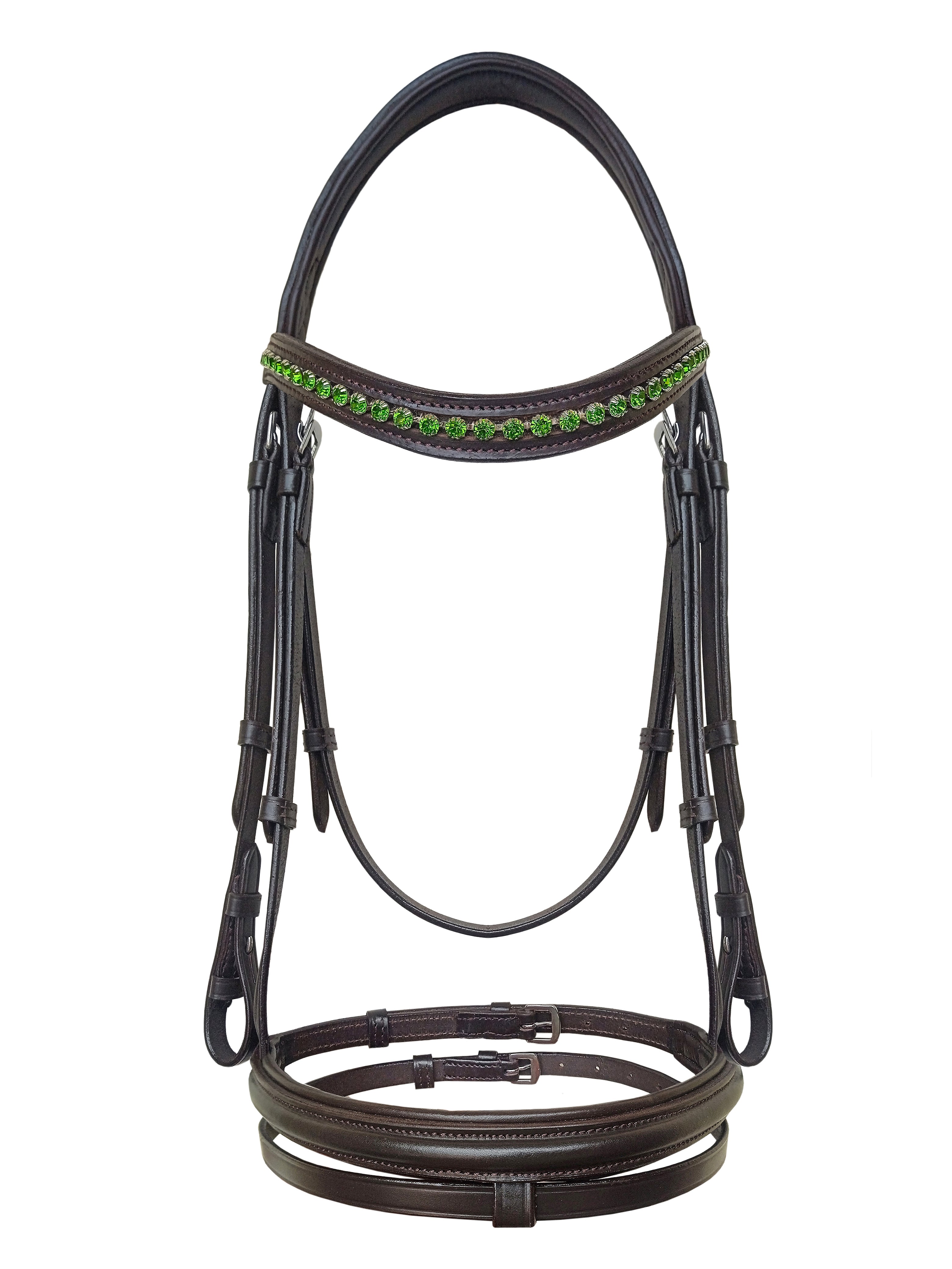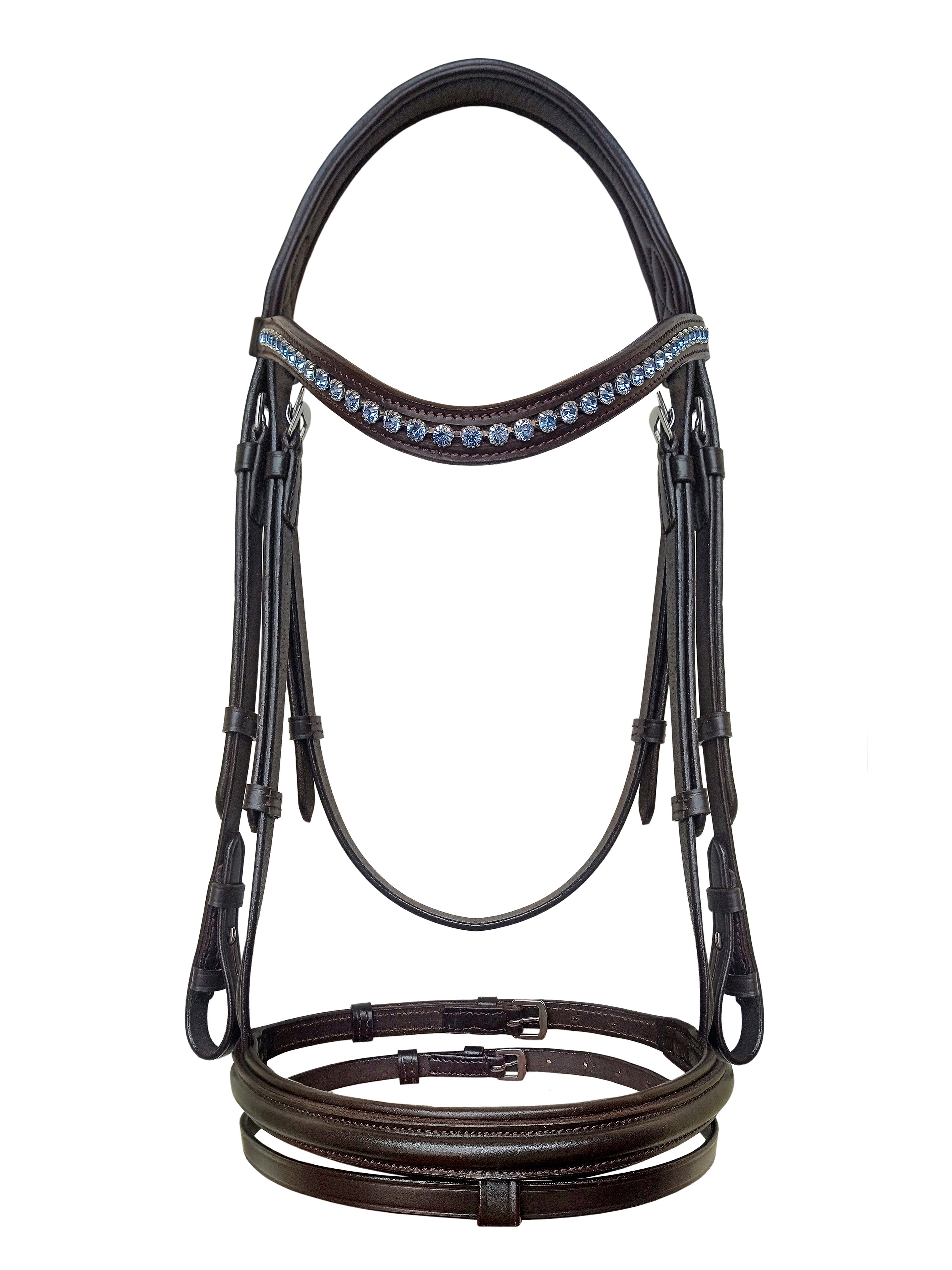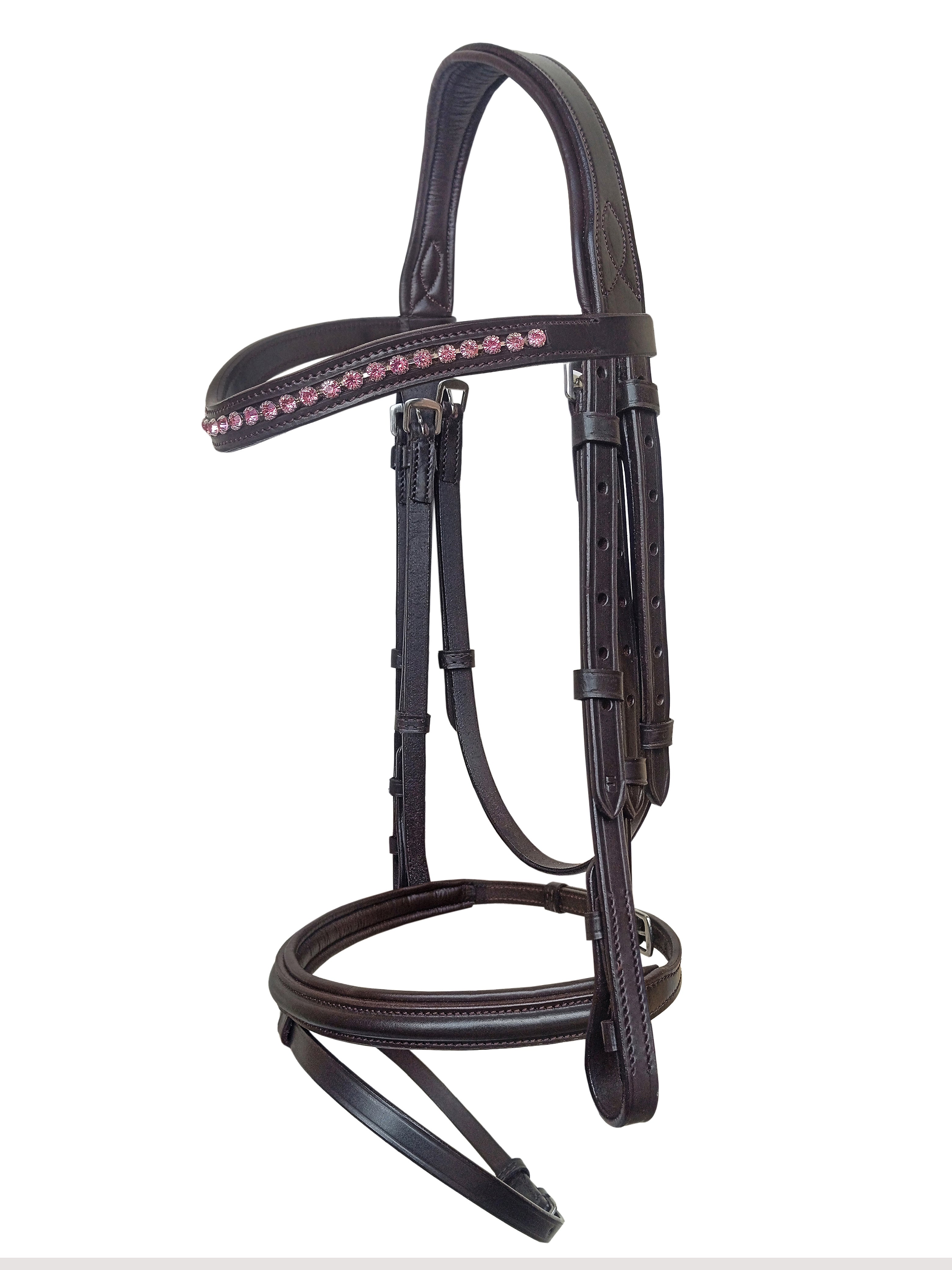 A hand-set crystal browband delivers show-ring brilliance, available in five elegant variants—Pink, Green, Light Blue, Blue/Silver, and Clear.