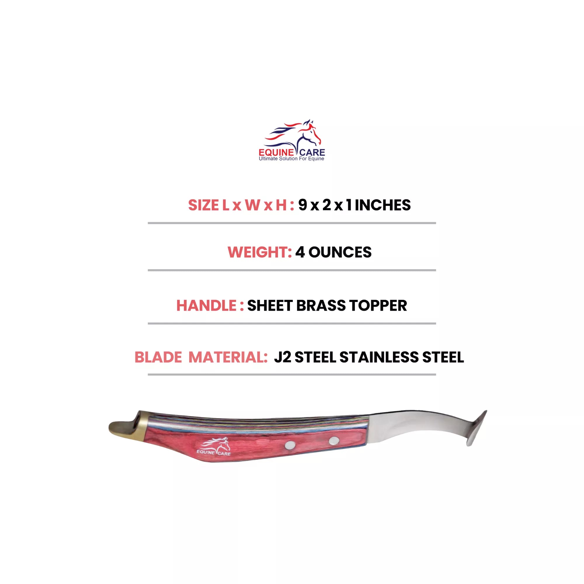 Hufschmiedmesser für die Pferdepflege – Klinge aus japanischem J2-Edelstahl mit integriertem Hufkratzer, Griff aus Messing und ergonomischem rotem Griff (für Rechts- und Linkshänder)