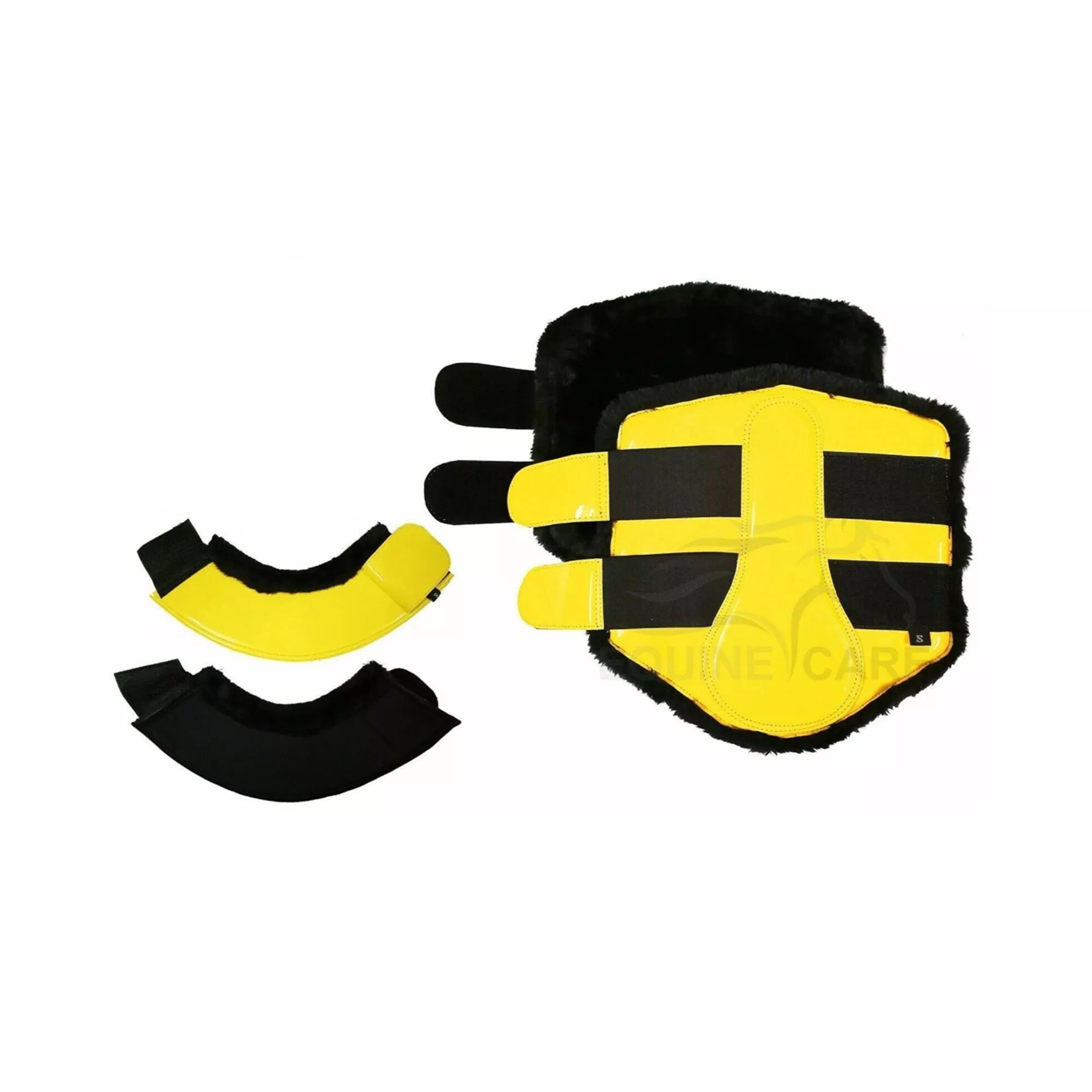 Diese Gamaschen für Pferdebeine bieten optimalen Schutz beim Training und Wettkampf. Dank des doppelten Schutzsystems besteht jede Gamasche aus einer harten, stoßfesten PVC-Außenschale und einem gepolsterten, atmungsaktiven Neopren-Innenfutter. Diese Kombination dämpft Stöße durch Hufaufprall und Bürsten und macht die Gamaschen ideal für Springen, Geländeritte und andere energieintensive Disziplinen.