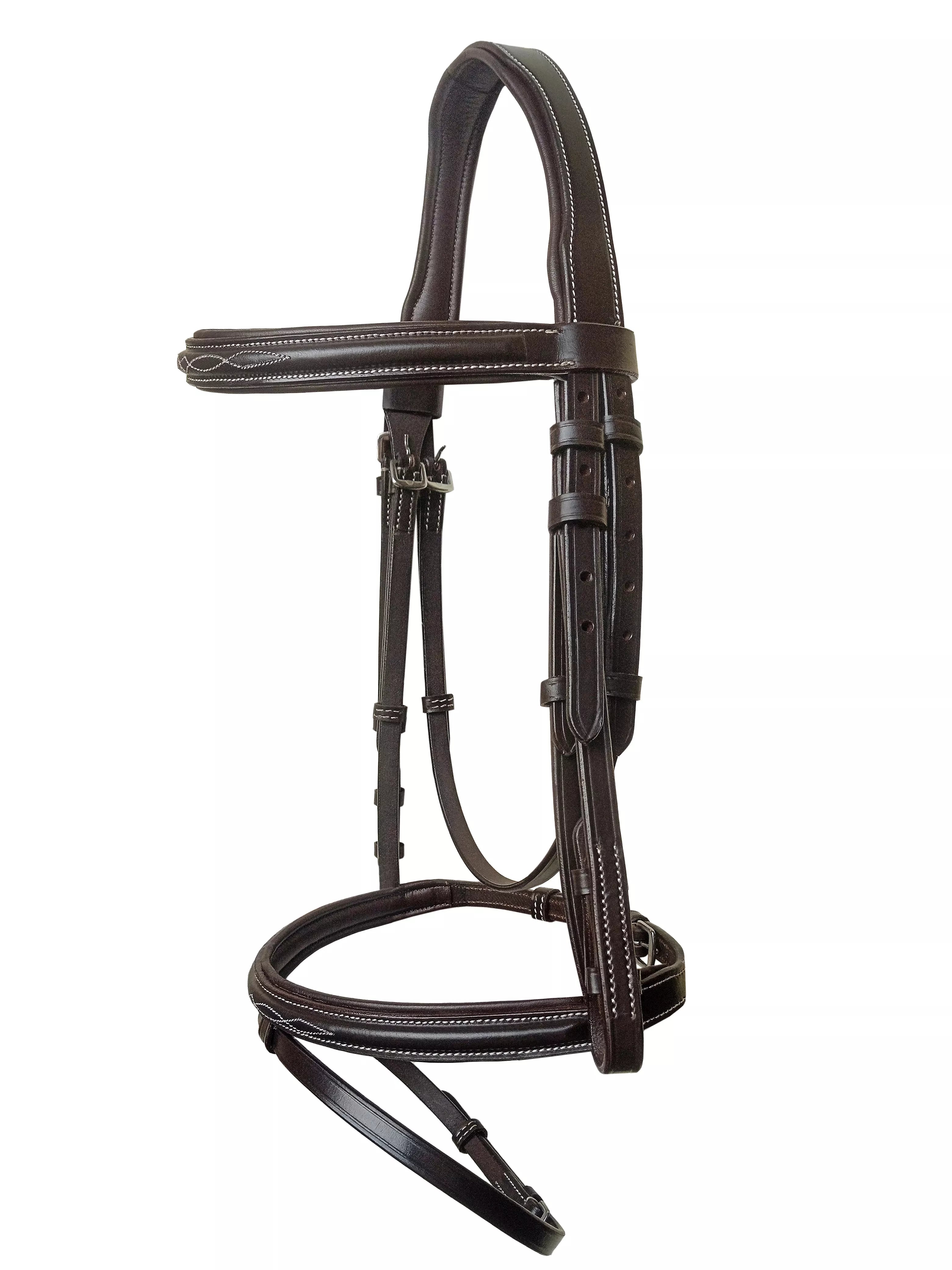 This English leather bridle blends durability and craftsmanship through reinforced double stitching and a drum-dyed finish that resists wear while remaining soft against your horse’s skin. Engineered for balance and control, it features triple-point padding across the crown, browband, and noseband. This ergonomic design relieves poll pressure, prevents rubbing, and promotes relaxation—ideal for hunter jumper, dressage, or daily schooling sessions.