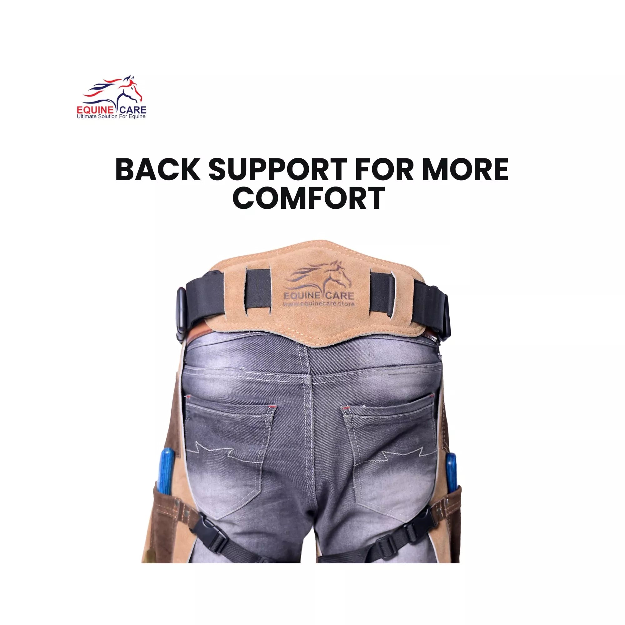 A breathable neoprene back-support belt cushions the lower back, relieving strain and promoting healthy posture. The contoured lumbar design distributes pressure evenly, offering ergonomic comfort through long hoof-care sessions.