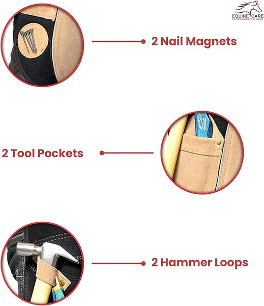 The adjustable farrier apron waist (28-52 inches) fits a wide range of body types, while quick-release straps guarantee a secure and slip-free fit. For maximum efficiency, it features dual knife pockets, hammer loops, and magnetic nail holders-making it a true farrier apron with knife pockets and farrier apron with magnet, keeping essential tools organized and within easy reach.